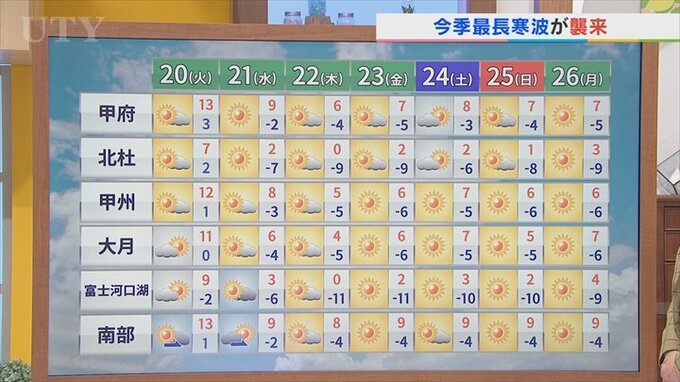 甲府で1年で一番最も寒い時期の気温が出て8℃前後なんです。それをさらに下回るような寒さとなります。