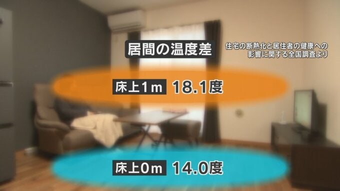 居間の中でも温度に差があり、床上1mでは18度を超えますが、足元(0m)は14度と、その差は4度もあります。