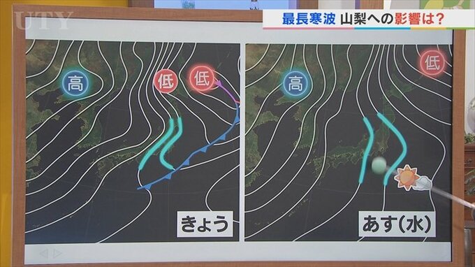 きょうは西に高気圧、東に低気圧の西高東低の気圧配置で、この白い線=等圧線の間隔が狭いと風が強くことを表しています。