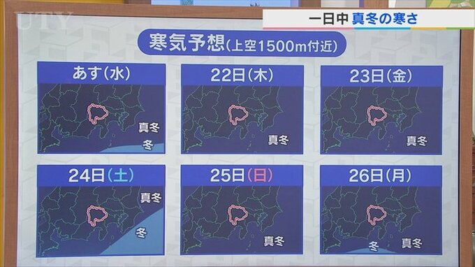 21日は寒気が南下して県内を覆うため一日中真冬の寒さに 米津龍一気象予報士が解説 山梨 2026年1月20日(火) 19:24 国内 天気 今後の寒さを上空の冷たい空気=寒気の予想を見ていきます。 あすから来週の月曜日にかけての6日分を用意していますが、赤枠は山梨で全部濃い青色の真冬並みの空気に覆われるんです。
