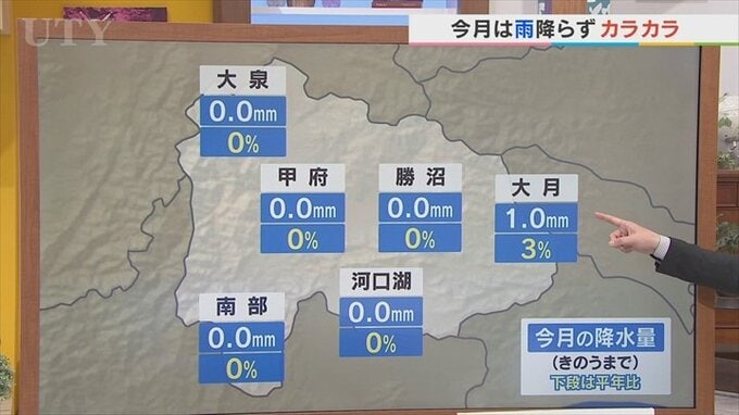 こちらは今月のきのうまでの降水量ですが、大月で1mm降っただけで大泉、甲府、勝沼、河口湖、南部は0.0mmと降っていないんです。