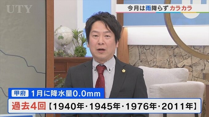 甲府の過去131年の歴史の中で、1月の降水量が0.0mmだったのが、たった4回です。