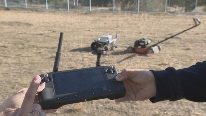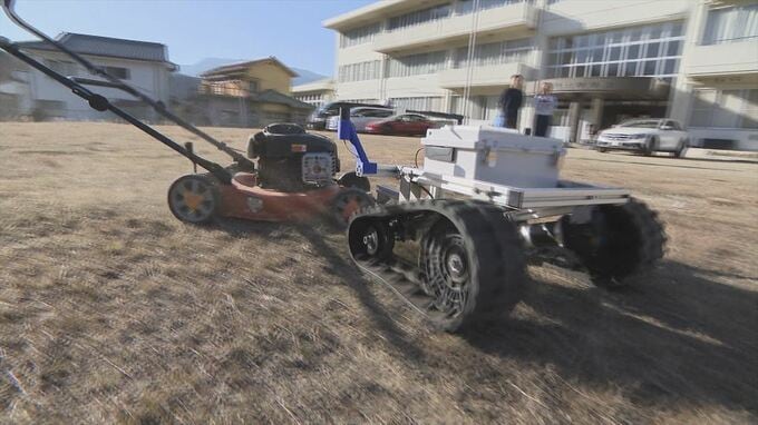 市販の芝刈り機にけん引する機械をつけたシンプルな仕組み。アトラックラボは無線操作できる けん引機を作り、RtoSはそこに自動で動くプログラムを組み込みました。