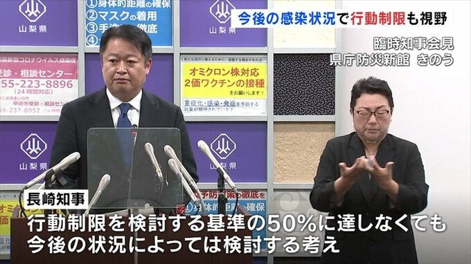 19日の時点で病床使用率は41.9%ですが、長崎知事は行動制限を検討する基準としていた50%に達しなくても今後の感染状況によっては行動制限を検討する考えを示しました。