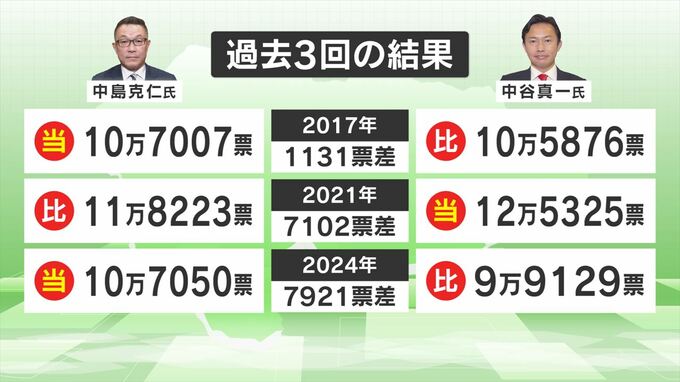 中島さんと中谷さんの過去3回の対決はいずれも、1000票から8000票以内の僅差となり、惜敗率も拮抗しています。