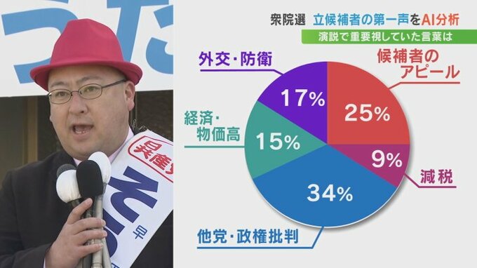 内訳を見ると、ほかの党・政権批判が34%、次いで候補者のアピールが25%、外交・防衛が17%などとなっています。