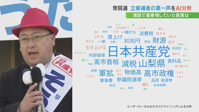 公認を受けている「日本共産党」を強調したほか、「減税」「財源」「軍拡」という言葉が多く出ました。