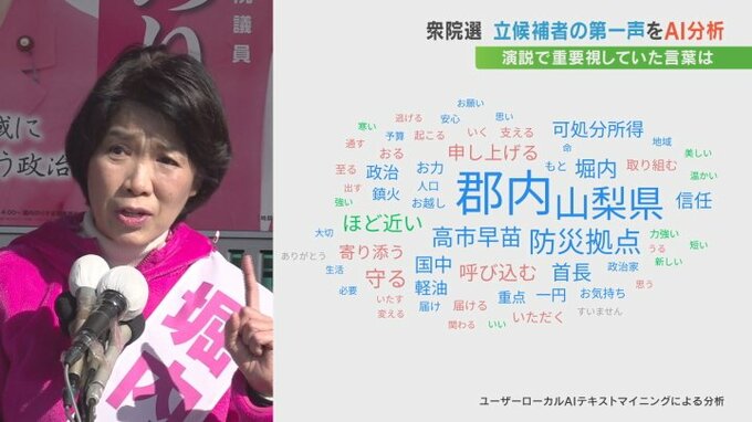 「郡内」や「山梨県」といった地域性がよく出たほか、山梨2区の特性を踏まえ「防災拠点」を強調していました。