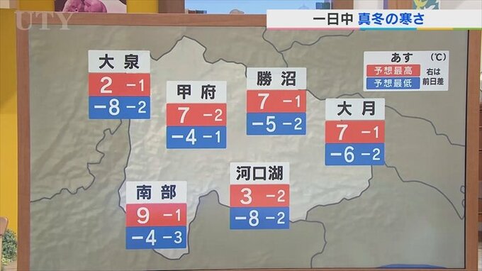 まず朝の最低気温は今朝と比べて2℃前後低くなります。-4℃、これが水道管の凍結の目安と言われていまして標高の高いところだけでなくて甲府や南部でも-4℃以下となりますからあすは県内全域で水道管の凍結に要注意です。