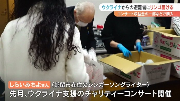 山梨県都留市のミュージシャンがウクライナから避難している人たちにリンゴを届けて励ましました。