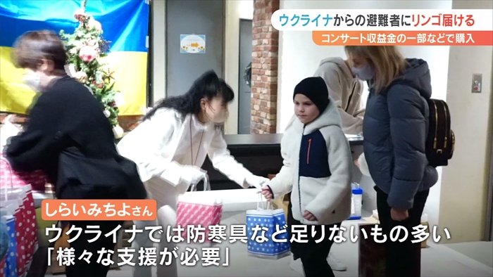 そして、12月18日、収益金の一部や募金で購入したリンゴおよそ1400個を、ウクライナから東京都内に避難している200人ほどに届けると共に日本各地に避難している人にも送りました。