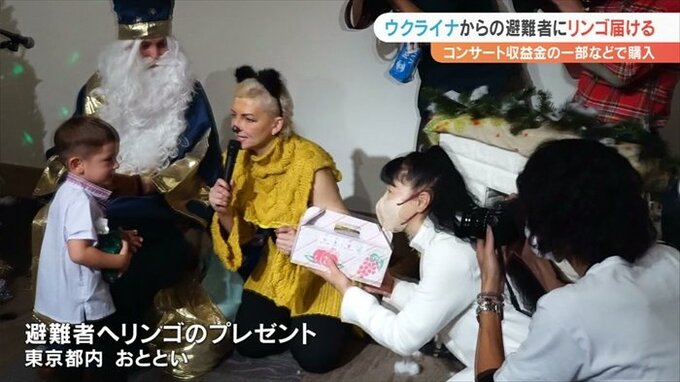そして、12月18日、収益金の一部や募金で購入したリンゴおよそ1400個を、ウクライナから東京都内に避難している200人ほどに届けると共に日本各地に避難している人にも送りました。