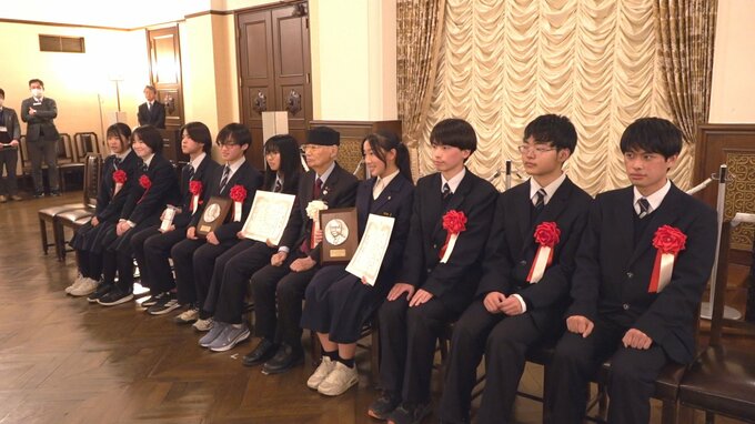 高校生部門では、伊奈ヶ湖の生態系や、バッタの視覚特性を研究した巨摩高校自然科学部の8人が受賞しました。