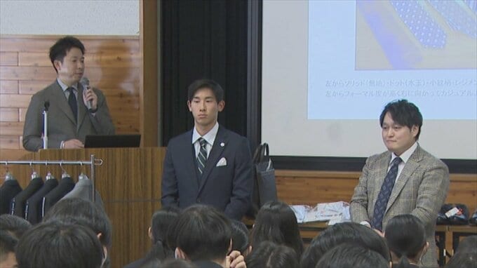 これは洋服専門店の満足屋が行ったもので、この春 卒業する3年生およそ180人が入社式や入学式で着る機会のあるスーツの着こなし方などを学びました。