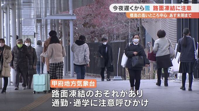 22日朝にかけては路面が凍結する恐れもあることから甲府地方気象台は注意を呼び掛けています。
