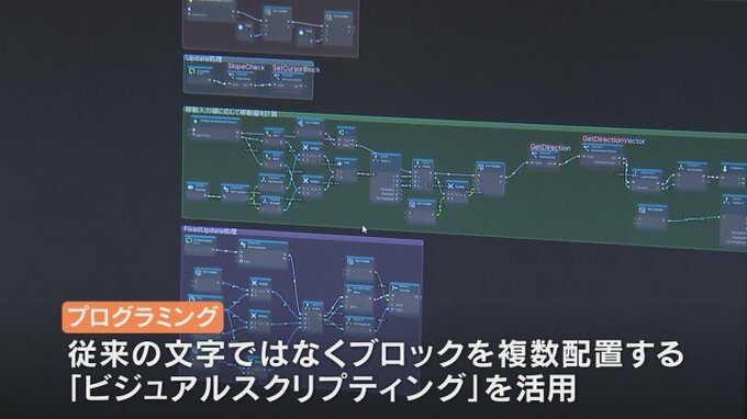 今回のプログラミングは従来の文字ではなく、ある程度プログラムされた「パーツ」を複数配置する最新技術「ビジュアルスクリプティング」を使いました。