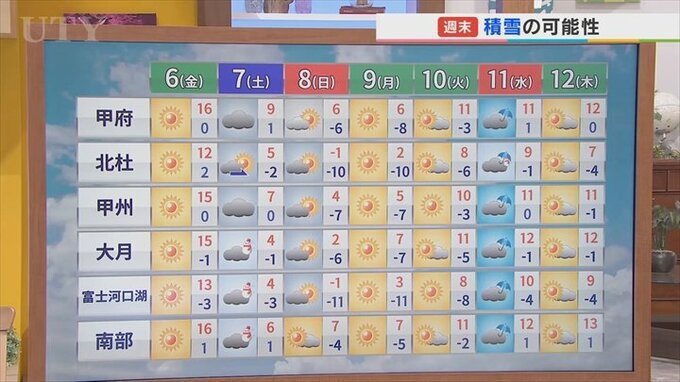 これを踏まえて週間天気を見ていきますと、今のところあさって雪マークをつけているのは大月や富士河口湖、南部のみとなっていますが、その他にも雪の範囲が広がる可能性があります。