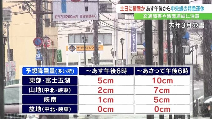7日午後6時までの24時間に降る雪の量は、多いところで東部・富士五湖で5㎝、中北と峡東の山地で2㎝、峡南で1㎝、さらにその後の24時間で、東部・富士五湖で10㎝、中北と峡東の山地で7㎝、峡南で5㎝と予想されています。