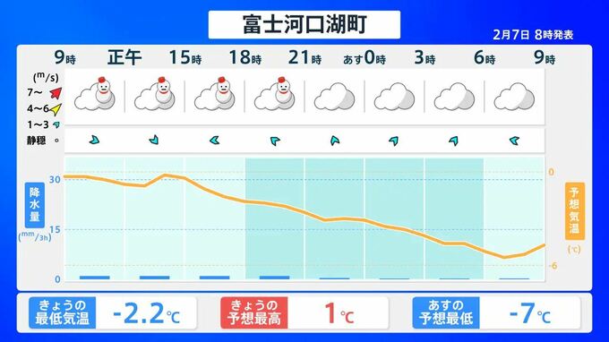 山梨県では7日昼前から8日昼過ぎにかけて雪や雨が降り、積雪となる所があるでしょう。