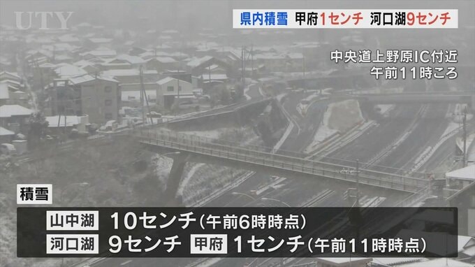 甲府地方気象台によりますと各地の積雪は午前6時の時点で山中湖で10センチ、午前11時の時点で河口湖で9センチ、甲府で1センチとなりました。