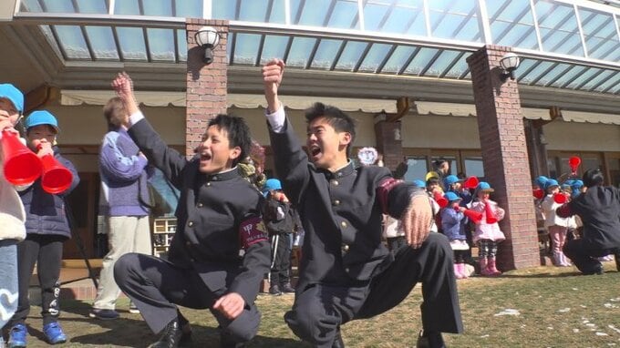 山梨県甲州市の赤尾保育園の園児が甲府工業の応援団と一緒に野球応援などの声出しに取り組みました。
