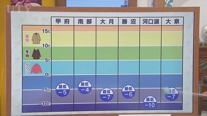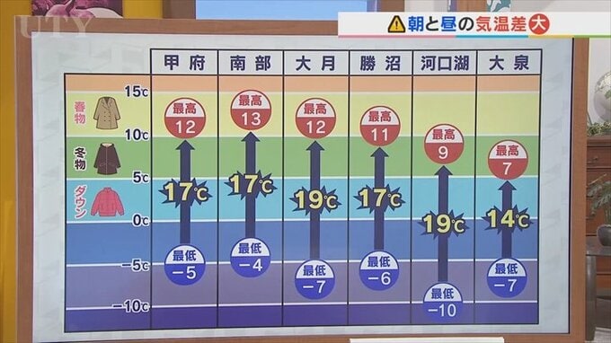 そこから気温がぐっと上がるんですが、どれぐらい上がるかというと、大月や河口湖は気温差19℃です。5℃につき着る物が1枚分違うと言われていますからおよそ服装4枚分の違いとなります。甲府や南部、勝沼でも17℃の気温差。
