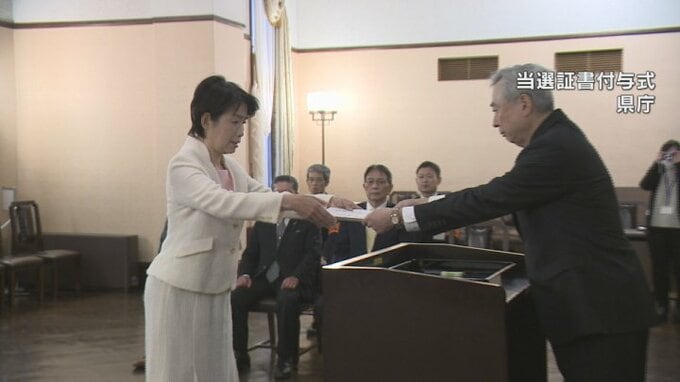 10日は県庁で当選証書の付与式が行われ、県選挙管理委員会の秋山洋委員長から2人に当選証書が手渡されました。