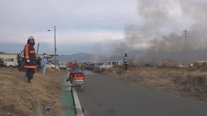 「爆発音と黒い煙」 少なくとも9台の車とタイヤが燃える 廃車置き場で火事 山梨 2026年2月10日(火) 18:12 国内 現場は玉諸小学校からおよそ500メートル南西の畑に囲まれている場所で、警察と消防が火事の状況を調べています。