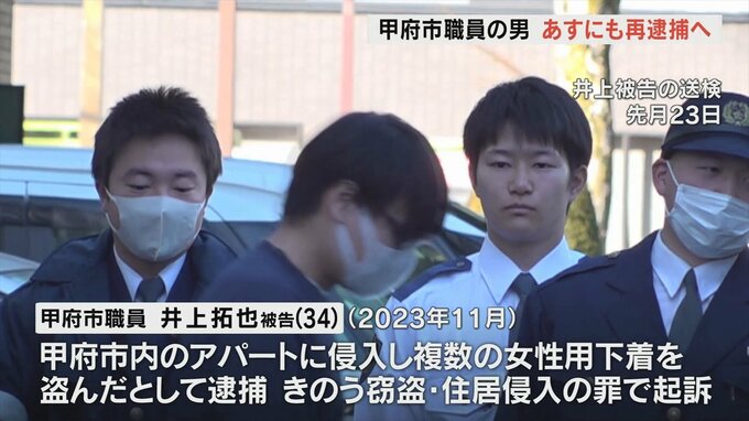 甲府市職員の井上拓也被告(34)は2023年11月甲府市のアパートに侵入し、複数の女性用の下着を盗んだとして1月逮捕され、10日に窃盗と住居侵入の罪で起訴されました。