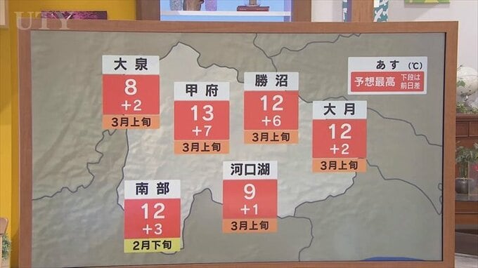 きょうと比べて6℃~7℃ほど高く3月上旬並みの気温。その他も2~3℃高くなるところが多くなりまして2月下旬~3月上旬ということで、もう10℃を上回るところでは、昼間はダウンを着なくても過ごせる陽気となる見込みです。