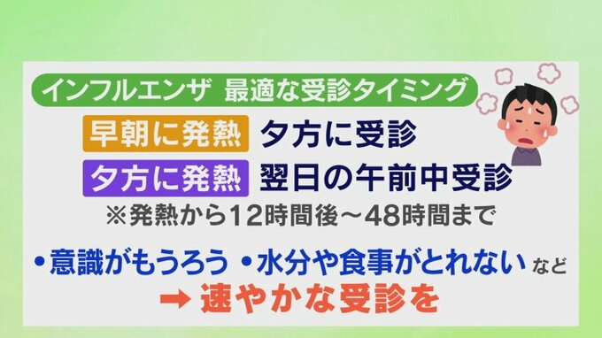 「発熱してから12時間がベストだが…」インフルエンザ 受診のポイントを医師に聞く 2026年2月12日(木) 19:22 国内 例えば、早朝に発熱した場合は夕方。夕方に発熱した場合は翌日の午前中が最適な受診のタイミングだということです。 ただし、ぐったりして意識がもうろうとしている、水分や食事がとれないなどの症状がある場合は速やかな受診を呼びかけています。