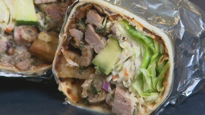 イタリア料理のポルケッタと、野菜がたっぷり詰まったブリトー。