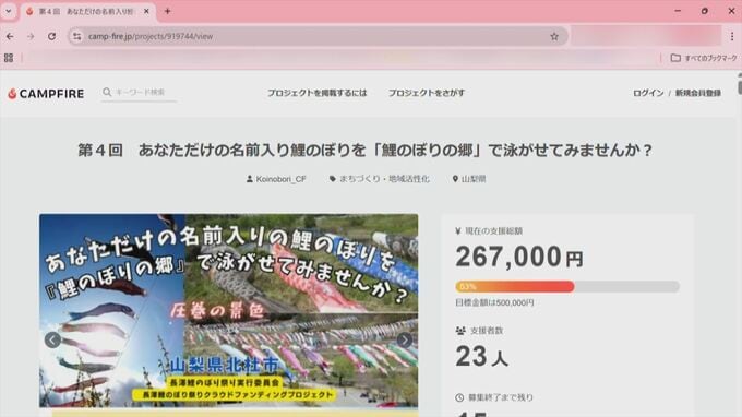 少子化でこいのぼりの寄付が減少 35年続く祭りの存続へ 実行委員会がクラウドファンディングで協力求める 山梨・北杜市 2026年2月17日(火) 20:00 国内 話題・グルメ 輿水孝司実行委員長は「子どもたちを大事にしたいという思いから祭りは始まり、協力してほしい」とコメントしています。