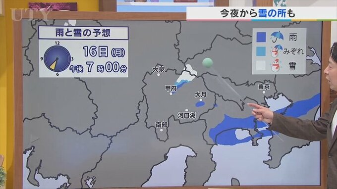 この後次第にこの範囲が東部や富士五湖を中心に広がっていく予想となっています。夜遅くにかけて雨や雪が降りやすい状況で、日付が変わってからはその範囲は狭くなっていくと予想しています。
