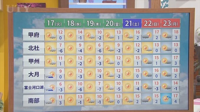 17日は昼前以降に日差し届くも冬の寒さに逆戻り 米津龍一気象予報士が解説 山梨 2026年2月16日(月) 19:54 国内 天気 それが一体いつなのか、週間天気で見ていきますとちょうど3連休。このタイミングが南から暖かい空気が流れ込んできて春の暖かさということになりそうです。 今週しばらく天気の崩れはないと見ています。 <県内各地点のあすの天気は動画をご覧ください>