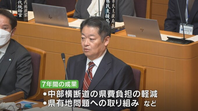 「前進をとめるわけにはいかない」長崎知事 3選目指し異例の早さで出馬表明 背景に前回選挙での県連の事実上分裂 山梨 2026年2月17日(火) 18:30 国内 暮らし・マネー 山梨県 長崎幸太郎知事: 「私は来る2027年の知事選挙におきまして、引き続き県政の先頭に立つ覚悟を固めました」 長崎知事は2期7年間の成果として中部横断道の県費負担の削減や県有地問題への取り組みなどを挙げました。