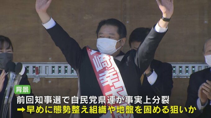 この時期に表明した背景には、前回の知事選で自民党県連が事実上分裂したいきさつがあり、早めに態勢を整え、組織や地盤を固める狙いがあるとみられます。