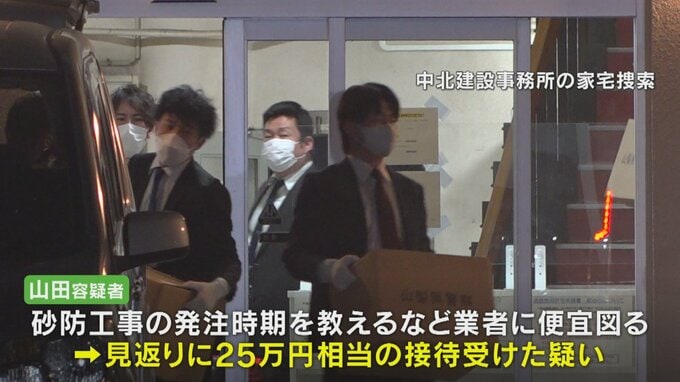 この事件は中北建設事務所の副主査山田晋容疑者が長野市の建設コンサルタント会社の役員岩﨑憲太郎容疑者に対し、砂防工事の発注時期を教えるなど便宜を図った見返りに飲食店などで約20回にわたり25万円相当の接待を受けたとして収賄容疑で逮捕・送検されたものです。