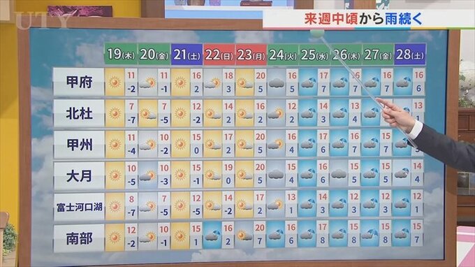 暖かさのピークとなりそうなのは、来週の月曜日。甲府、勝沼、大月、南部で20℃を予想しています。