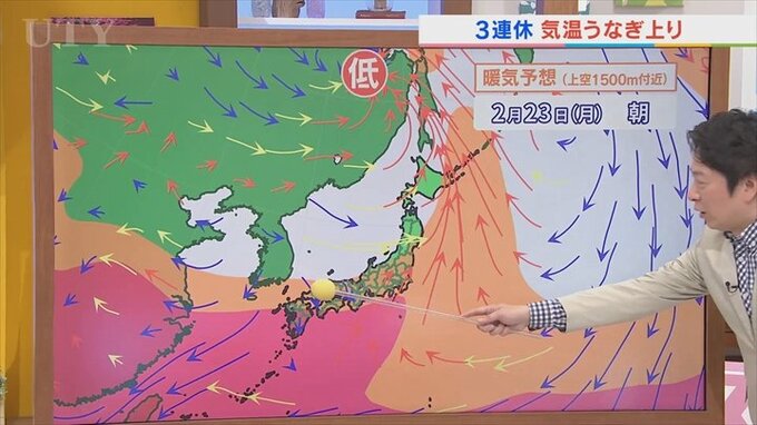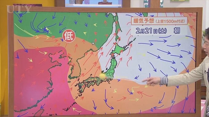 ところが日曜日になるとこの低気圧が東に進んで、これに向かって暖かい空気が流れ込んできて