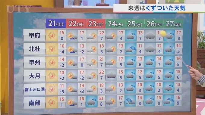前線が停滞しやすいのは、この水曜日以降となりまして曇りや雨でも気温は高いんです。ですから、この標高の高い北杜や、富士河口湖町でも雪ではなく、今のところ雨を予想しています。