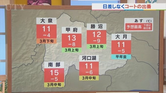 きょうと比べて甲州市勝沼は9℃低い12℃予想。そして河口湖は6℃低い11℃、甲府も8℃低い13℃ですから気温自体はガクッと下がるんですが大月はこれで平年並み。その他も3月並みの気温ですからこの時期としては高めです。