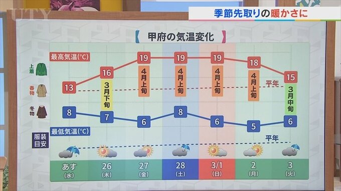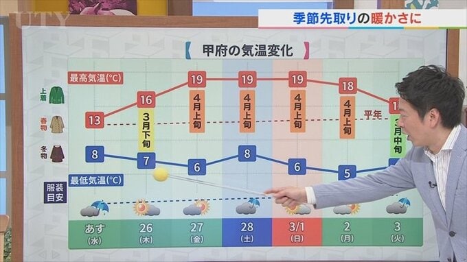 今後の気温についてですが、きょうは甲府で20℃を超える暖かさとなりましたがあすは雨の影響で気温は一旦下がります。