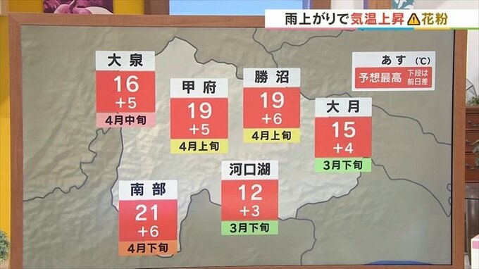 しかも雨上がりで気温が上昇すると、花粉が多く飛びやすくなりますので花粉症の方、あすはしっかりと対策をお願いします。