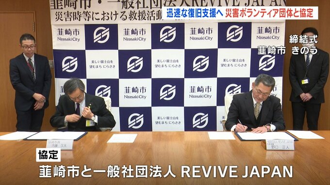 韮崎市と協定を結んだのは一般社団法人REVIVE JAPANで25日は関係者が出席し協定書にサインしました。