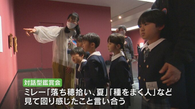 園児らは案内人とともにミレーの代表作「落ち穂拾い、夏」や「種をまく人」など11種類の絵画を見てまわり感じたことを言い合いました。