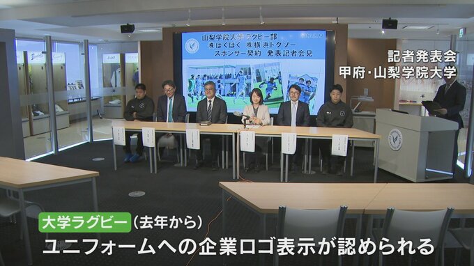 大学ラグビーは、去年からユニフォームへの企業ロゴの表示が認められていて、関東大学リーグ2部に所属する山梨学院大学ラグビー部は、今回 中央市の食品メーカー『はくばく』と、千葉県のトラック販売会社の『横浜トクソー』とスポンサー契約を結びました。