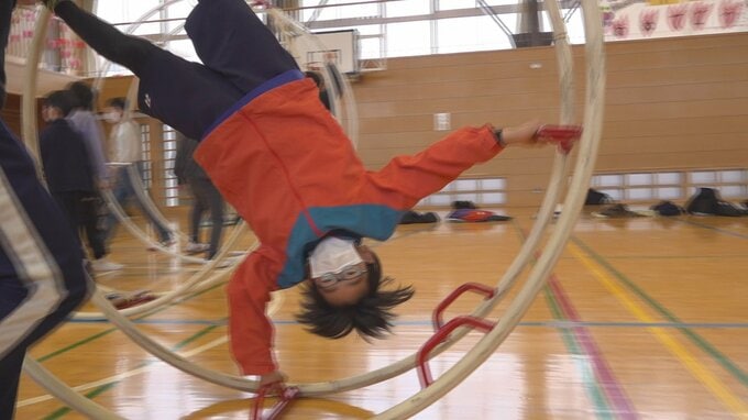 子どもたちは高橋さんの見本の後、ラートで横に1回転することに挑戦しました。