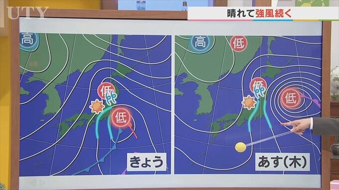 等圧線の間隔が狭い状況が続く見通しで、これによって強風が続きます。