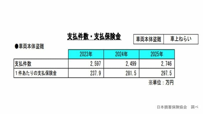 盗難車被害 2位は埼玉県 全国トップはその約2倍で被害集中 複数の防犯対策が有効 2026年3月9日(月) 12:00 国内 暮らし・マネー 「車両本体盗難」 ▽2025年 車両本体盗難 2746件 ▽2024年 車両本体盗難 2499件 ▽2023年 車両本体盗難 2597件
